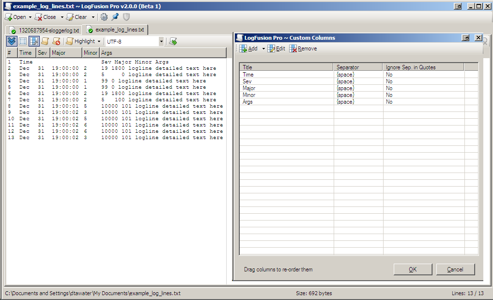 Time Sev Major Minor Args Dec 31 19:00:00 2 19 1800 logline detailed text here Dec 31 19:00:00 2 5 0 logline detailed text here Dec 31 19:00:00 1 99 0 logline detailed text here Dec 31 19:00:00 1 99 0 logline detailed text here Dec 31 19:00:00 2 19 1800 logline detailed text here Dec 31 19:00:00 2 5 100 logline detailed text here Dec 31 19:00:01 5 10000 101 logline detailed text here Dec 31 19:00:02 3 10000 101 logline detailed text here Dec 31 19:00:02 5 10000 101 logline detailed text here Dec 31 19:00:02 6 10000 101 logline detailed text here Dec 31 19:00:02 6 10000 101 logline detailed text here Dec 31 19:00:02 3 10000 101 logline detailed text here