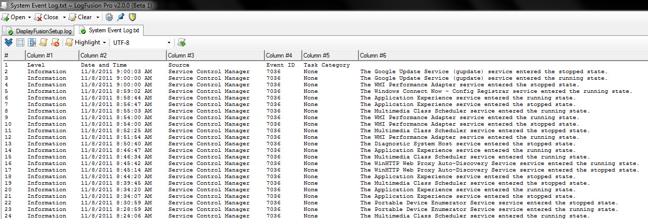 TypeDateTimeSourceCategoryEventUserComputer Error11/3/20119:31:08 PMInvScanNone14N/ASRV001 Information11/3/20118:49:25 PMSymantec AntiVirusNone7N/ASRV001 Information11/3/20118:48:00 PMWinMagicSDNone0N/ASRV001 Information11/3/20118:46:36 PMSceCliNone1704N/ASRV001 Information11/3/20118:46:20 PMSymantec AntiVirusNone14N/ASRV001 Information11/3/20118:45:43 PMbtwdinsNone0N/ASRV001 Information11/3/20118:45:25 PMSecurityCenterNone1807N/ASRV001 Information11/3/20118:45:22 PMVMware NAT ServiceNone1000N/ASRV001 Information11/3/20118:45:21 PMVMware NAT ServiceNone1000N/ASRV001 Information11/3/20118:45:13 PMMSSQL$SQLEXPRESSServer 3408N/ASRV001